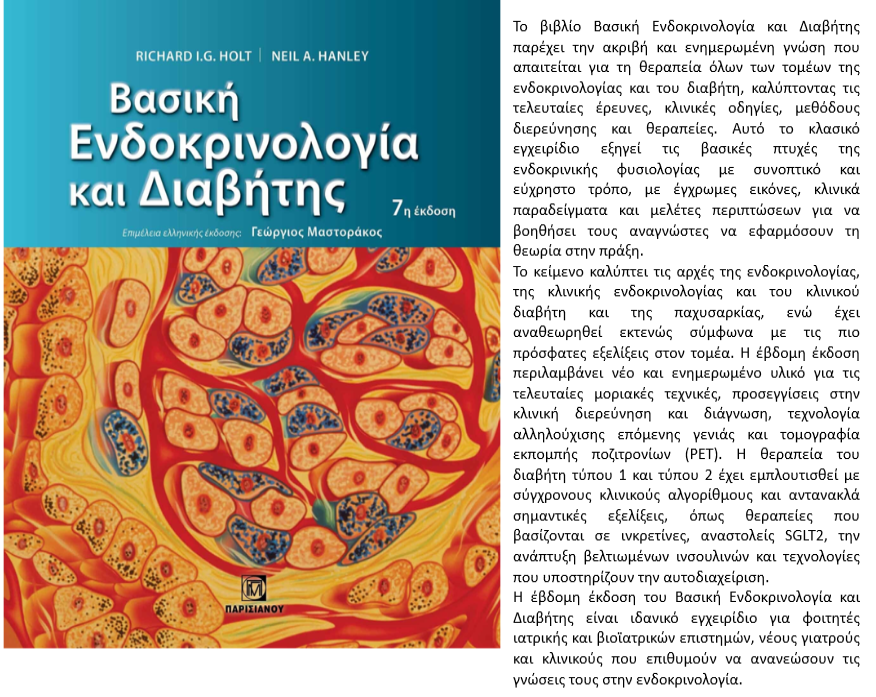 Νέα Έκδοση του βιβλίου ΒΑΣΙΚΗ ΕΝΔΟΚΡΙΝΟΛΟΓΙΑ ΚΑΙ ΔΙΑΒΗΤΗΣ (7Η ΕΚΔ.) με την επιμέλεια του Καθηγητή Ενδοκρινολογίας Ε.Κ.Π.Α, κ. Γεωργίου Μαστοράκου